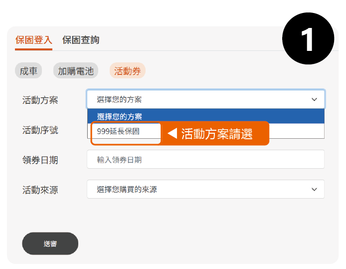 至 保固專區>活動券,活動方案選擇「999延長保固」輸入專屬「活動序號」,完成填表後點擊送審,待官方完成審核後,即獲得正式電子保卡,享原保固內容外,再升級延長兩年福利!